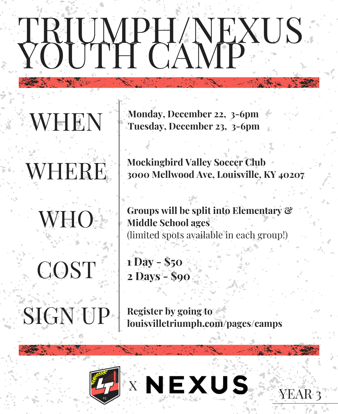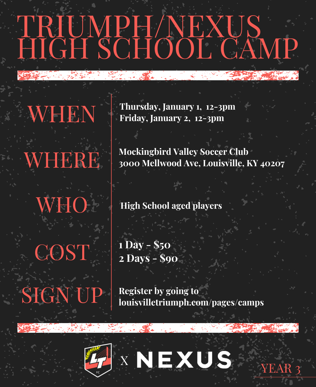 We're hosting a two-day camp for high school players on January 1 and 2! Spend the new year with us as we work on soccer skills while spending time with Triumph players and coaches.